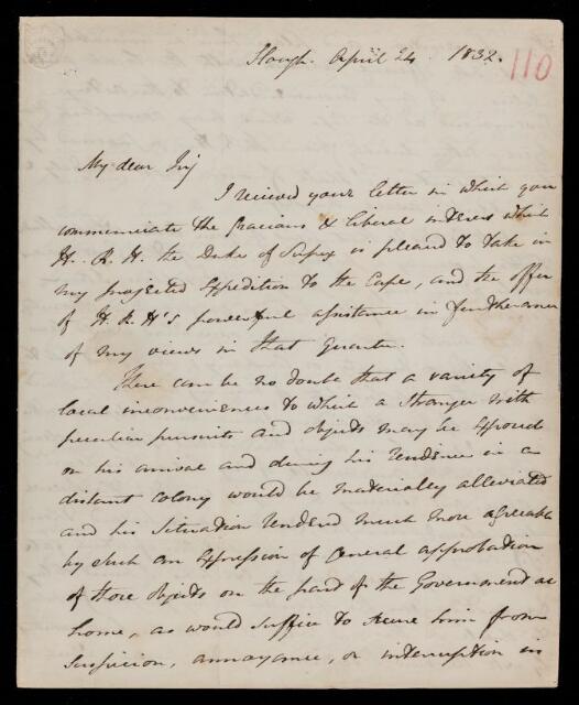 Autograph letter signed by sender. Is grateful for the offer of assistance from Frederick Augustus (Duke of Sussex), but would not care to avail himself of public funds as his intended visit is for his own private reasons.