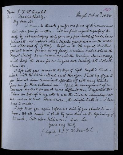 John Frederick William Herschel, Sir; John Frederick William Herschel, Letter, from Sir John Herschel to Francis Baily, dated at Slough, 15 October 1833, HS/3/116, The Royal Society Archives, London, https://makingscience.royalsociety.org/items/hs_3_116/letter-from-sir-john-herschel-to-francis-baily-dated-at-slough, accessed on 07 November 2025