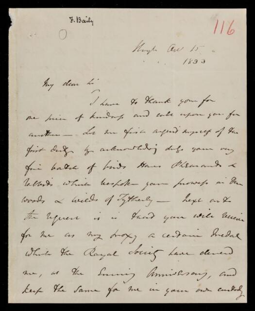 Autograph letter signed by sender. Thanks for the gift of pheasants. Would he receive John Frederick William Herschel's medal from the Royal Society [of London] for him and keep it until he can collect it. Will call on him next week.