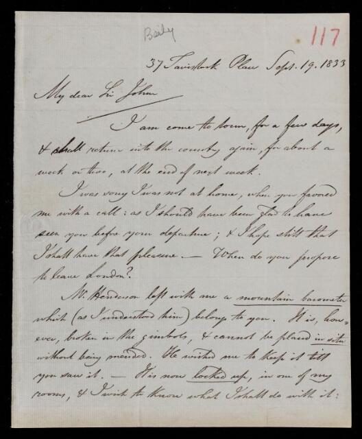 Autograph letter signed by sender. Is at present in town. Sorry he was out when John Frederick William Herschel called. What shall he do with John Frederick William Herschel's barometer? Thanks for the telescopic tests.