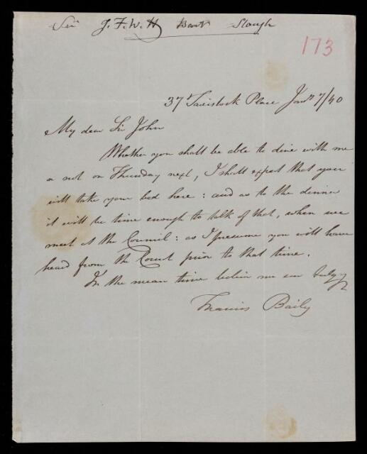 Letter, from Francis Baily to Sir John Herschel, dated at 37 Tavistock Place
