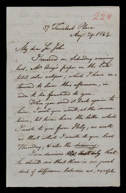 Autograph letter signed by sender. Has read G. B. Airy's paper on the eclipse. Would John Frederick William Herschel send on Francis Baily's remarks on the eclipse to Airy. Comments on the phenomenon of the eclipse.