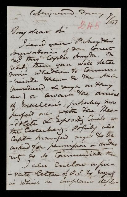 Autograph letter signed by sender. Has received observations of the comet from C. P. Smyth, which he may like to communicate to the Royal Astronomical Society Comments on the deplorable state of the Cape Town [?] Observatory.