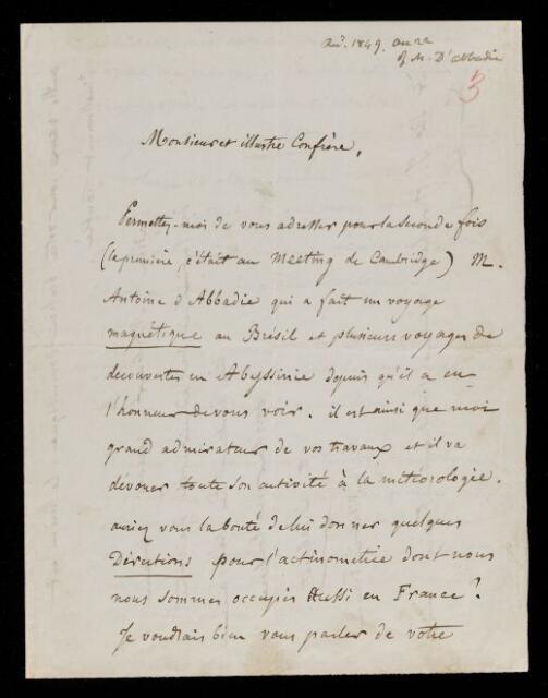 Autograph letter signed by sender. Presenting A. T. D'Abbadie, who has made a voyage to Brazil. Remarks on John Frederick William Herschel's calorimeter.