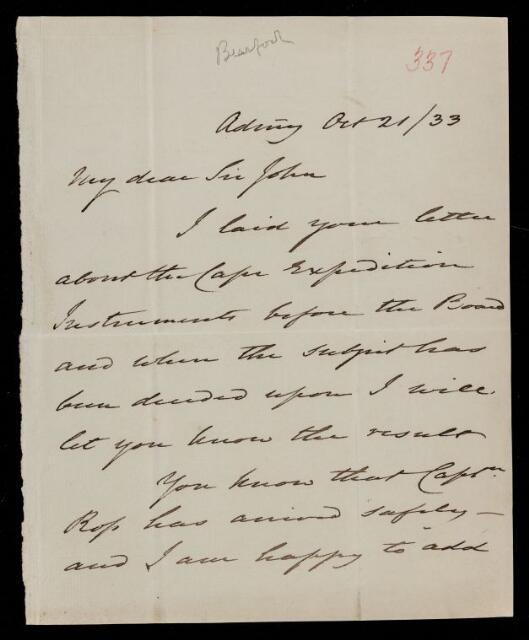 Francis Beaufort, Sir Francis Beaufort, Letter, from Francis Beaufort to Sir John Herschel, dated at Admiralty, 21 October 1833, HS/3/337, The Royal Society Archives, London, https://makingscience.royalsociety.org/items/hs_3_337/letter-from-francis-beaufort-to-sir-john-herschel-dated-at-admiralty, accessed on 25 January 2026