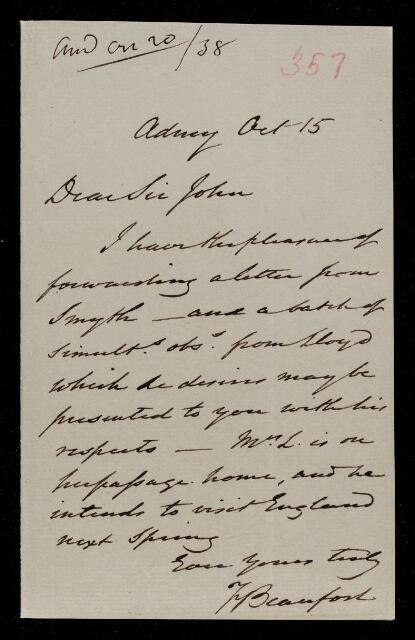 Francis Beaufort, Sir Francis Beaufort, Letter, from Francis Beaufort to Sir John Herschel, dated at Admiralty, 15 October 1838, HS/3/357, The Royal Society Archives, London, https://makingscience.royalsociety.org/items/hs_3_357/letter-from-francis-beaufort-to-sir-john-herschel-dated-at-admiralty, accessed on 21 January 2026