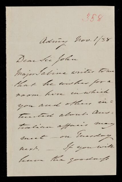 Autograph letter signed by sender. Has prepared a room for him and Edward Sabine to discuss Australian affairs on Tuesday next.