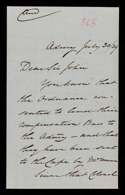 Autograph letter signed by sender. Would like his opinion on whether an officer should be sent to the Cape to be in charge of the compensation bars sent there recently by the Board of Ordnance.