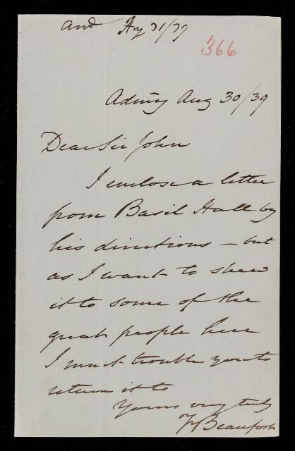Autograph letter signed by sender. Sending a letter of Basil Hall's, which please return when he has read it.