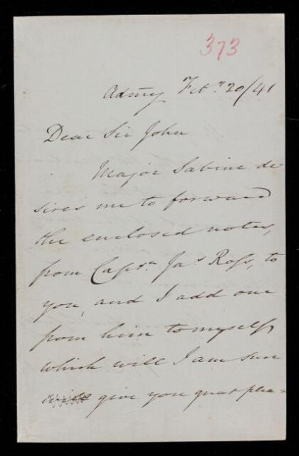 Autograph letter signed by sender. Edward Sabine has asked him to forward J. C. Ross's notes. If John Frederick William Herschel has finished with Thomas Maclear's letter would he return it.