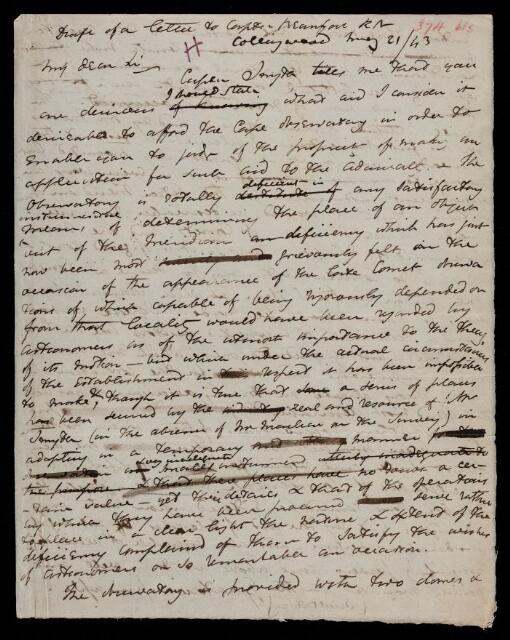 Draft letter, from Sir John Herschel to Francis Beaufort, dated at Collingwood