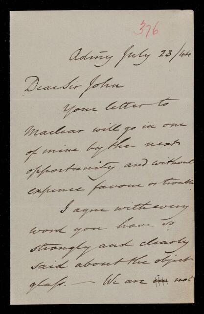 Autograph letter signed by sender. Will send his letter to Thomas Maclear with one of his own. Agrees with him regarding the object glass, but feels that English artists should be encouraged.