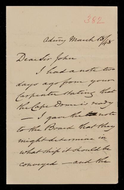 Autograph letter signed by sender. Has had a note from the carpenter stating that the dome is ready; will notify him when the ship in which it is to sail is decided. The two papers of the Admiralty Manual are in progress by W. J. Hamilton and F. W. Beechey.