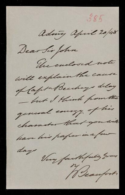 Francis Beaufort, Sir Francis Beaufort, Letter, from Francis Beaufort to Sir John Herschel, dated at Admiralty, 20 April 1848, HS/3/385, The Royal Society Archives, London, https://makingscience.royalsociety.org/items/hs_3_385/letter-from-francis-beaufort-to-sir-john-herschel-dated-at-admiralty, accessed on 12 November 2025