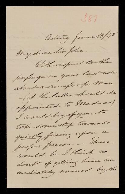 Autograph letter signed by sender. Regarding a successor to William Mann should the latter be appointed to Madras.