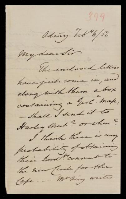 Autograph letter signed by sender. Encloses recently received letters and a geological map. Shall he send it to Harley St.? There is a strong possibility that the Cape will get a transit circle. William Simms has a good object glass; does John Frederick William Herschel know anything about it?