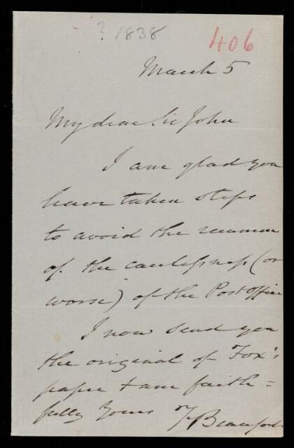 Autograph letter signed by sender. Is pleased to hear that John Frederick William Herschel has taken steps to avoid the carelessness at the Post Office. Sends original of R. W. Fox's paper.