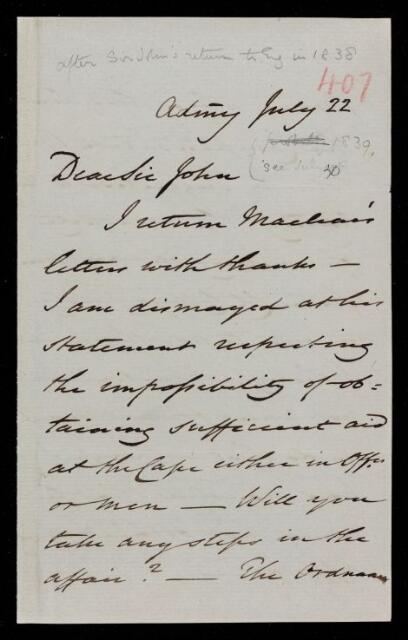 Francis Beaufort, Sir Francis Beaufort, Letter, from Francis Beaufort to Sir John Herschel, dated at [Admiralty], 22 July 1839, HS/3/407, The Royal Society Archives, London, https://makingscience.royalsociety.org/items/hs_3_407/letter-from-francis-beaufort-to-sir-john-herschel-dated-at-admiralty, accessed on 25 January 2026
