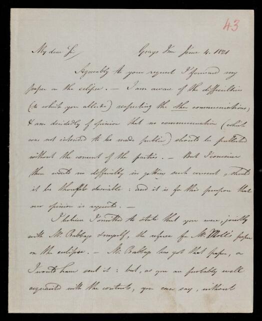 Autograph letter signed by sender. Is forwarding his paper on the eclipse. Publication of information received from members. Regarding the refereeing of Gerard Moll's paper on the eclipse.