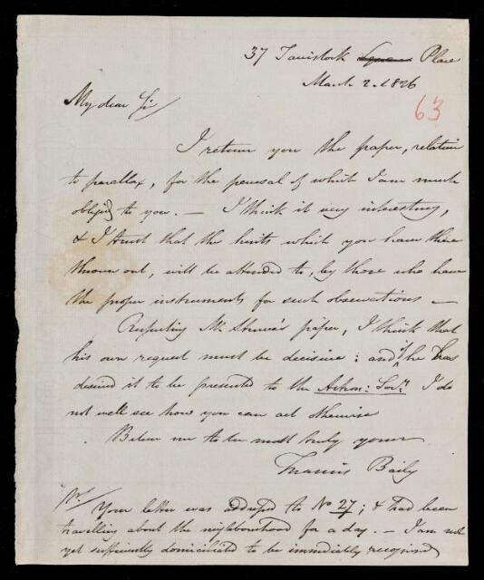 Francis Baily, Francis Baily, Letter, from Francis Baily to Sir John Herschel, dated at 37 Tavistock Place, 2 March 1826, HS/3/63, The Royal Society Archives, London, https://makingscience.royalsociety.org/items/hs_3_63/letter-from-francis-baily-to-sir-john-herschel-dated-at-37-tavistock-place, accessed on 10 November 2025
