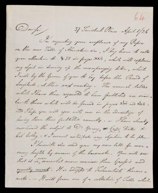 Autograph letter signed by sender. Is sending his paper on the aberration so that it can be laid before the Board of Longitude. Also sending new table for the measurement of heights by means of the barometer. Regarding the distribution of the Memoirs to Associates.