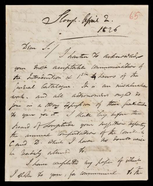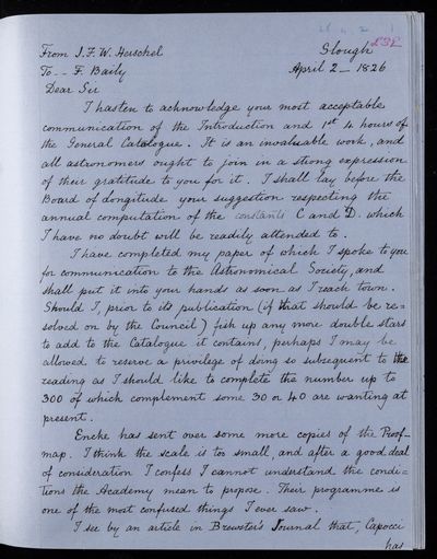 John Frederick William Herschel, Letter, from Sir John Herschel to Francis Baily, dated at Slough, 2 April 1826, HS/3/65, The Royal Society Archives, London, https://makingscience.royalsociety.org/items/hs_3_65/letter-from-sir-john-herschel-to-francis-baily-dated-at-slough, accessed on 09 December 2025