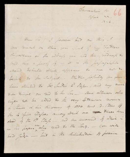 John Frederick William Herschel, Incomplete letter, from Sir John Herschel to Francis Baily, dated at Devonshire St., 22 April 1826, HS/3/66, The Royal Society Archives, London, https://makingscience.royalsociety.org/items/hs_3_66/incomplete-letter-from-sir-john-herschel-to-francis-baily-dated-at-devonshire-st, accessed on 20 April 2026