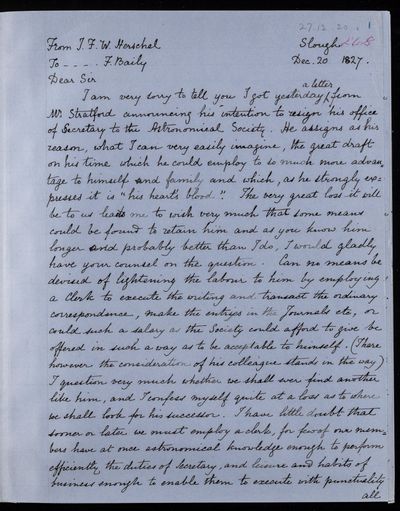 John Frederick William Herschel, Sir; John Frederick William Herschel, Letter, from Sir John Herschel to Francis Baily, dated at Slough, 20 December 1827, HS/3/70, The Royal Society Archives, London, https://makingscience.royalsociety.org/items/hs_3_70/letter-from-sir-john-herschel-to-francis-baily-dated-at-slough, accessed on 07 November 2025