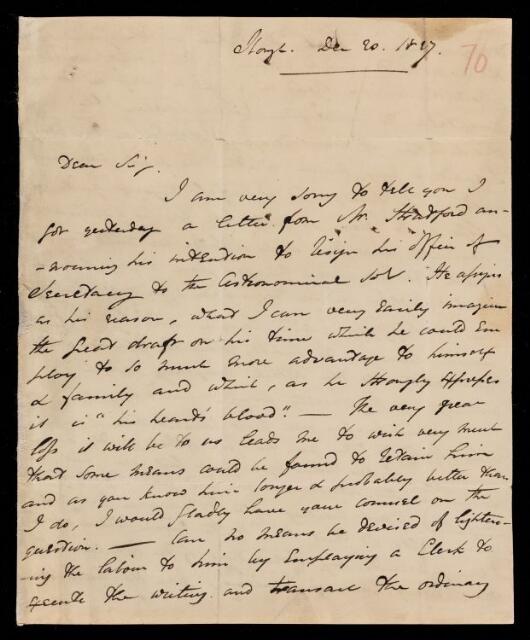 Autograph letter signed by sender. Has just had a letter from W. S. Stratford announcing his decision to resign from the secretaryship of the Astronomical Society. Comments on this. He himself is also thinking of resigning the Presidency at the Anniversary meeting. Regarding the microscopes.