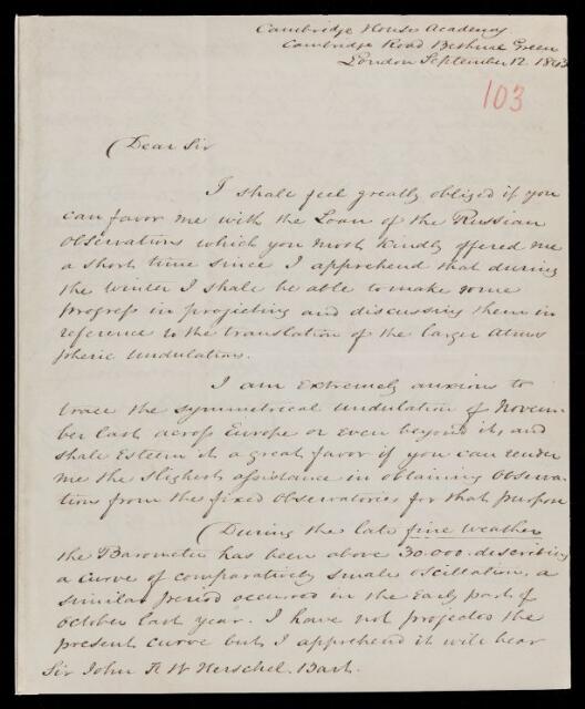Autograph letter signed by sender. Could he loan him the Russian observations. Recent readings of the barometer.