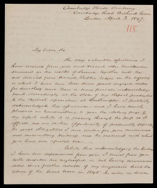 William Radcliffe Birt, Letter, from William Radcliffe Birt to Sir John Herschel, dated at Bethnal Green, 3 April 1847, HS/4/115, The Royal Society Archives, London, https://makingscience.royalsociety.org/items/hs_4_115/letter-from-william-radcliffe-birt-to-sir-john-herschel-dated-at-bethnal-green, accessed on 14 November 2025