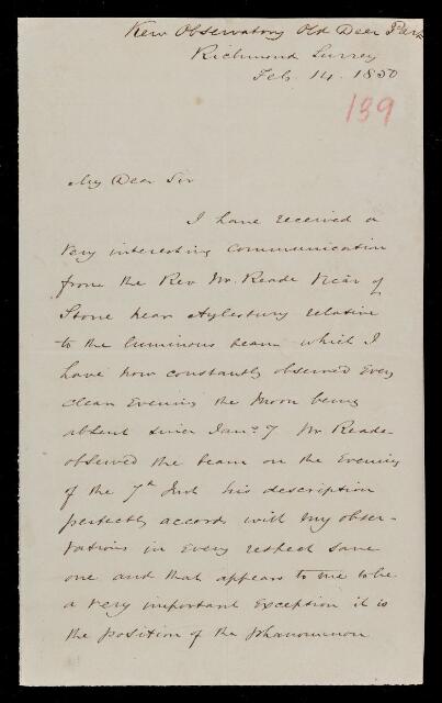Autograph letter signed by sender. Has received an interesting communication from the Rev. J. B. Reade of Stone, near Aylesbury, on the zodiacal light. Comments on this.