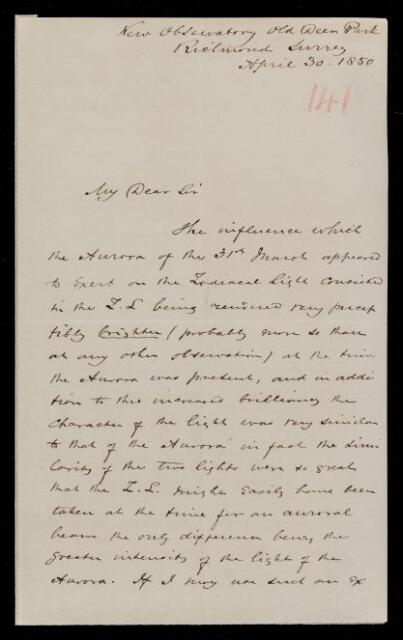Autograph letter signed by sender. Outlining the influence of the recent aurora on the zodiacal light.