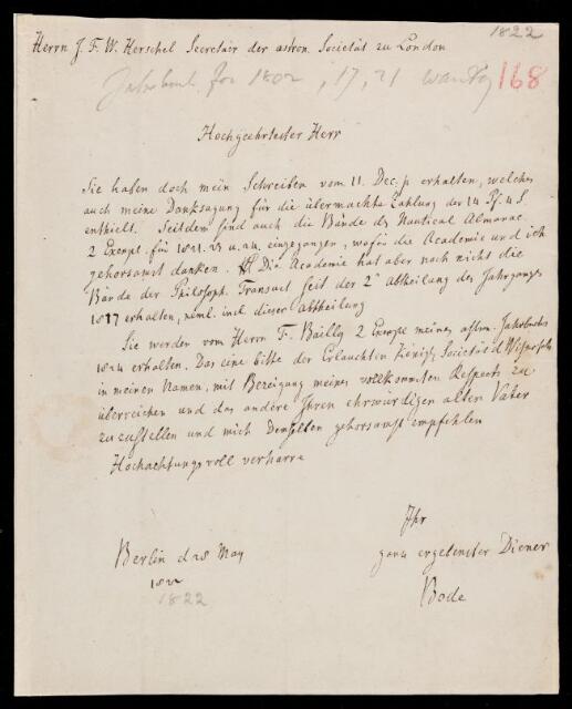 Johann Elert Bode, Johann Elert Bode, Letter, from Johann Elert Bode to Sir John Herschel, dated at Berlin, 28 May 1822, HS/4/168, The Royal Society Archives, London, https://makingscience.royalsociety.org/items/hs_4_168/letter-from-johann-elert-bode-to-sir-john-herschel-dated-at-berlin, accessed on 08 March 2026