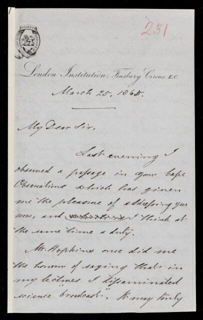Edward William Brayley, Letter, from Edward William Brayley to Sir John Herschel, dated at London Institution, 25 March 1865, HS/4/231, The Royal Society Archives, London, https://makingscience.royalsociety.org/items/hs_4_231/letter-from-edward-william-brayley-to-sir-john-herschel-dated-at-london-institution, accessed on 10 March 2026