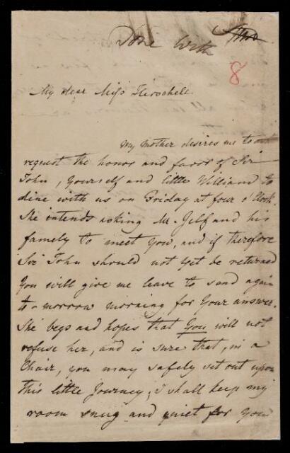 Autograph letter signed by sender. Invitation to Caroline, Sir John, and William Herschel to dine with her on Friday.