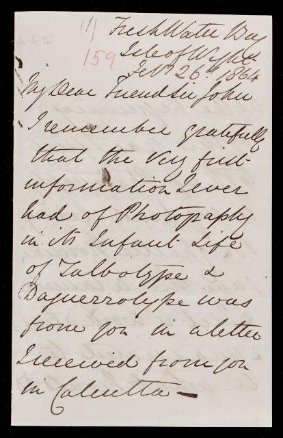 Julia Margaret Cameron, Letter, from Julia Margaret Cameron to Sir John Herschel, dated at Freshwater, Isle of Wight, 26 February 1864, HS/5/159, The Royal Society Archives, London, https://makingscience.royalsociety.org/items/hs_5_159/letter-from-julia-margaret-cameron-to-sir-john-herschel-dated-at-freshwater-isle-of-wight, accessed on 07 March 2026