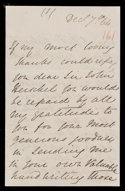 Julia Margaret Cameron, Letter, from Julia Margaret Cameron to Sir John Herschel, 7 December 1864, HS/5/161, The Royal Society Archives, London, https://makingscience.royalsociety.org/items/hs_5_161/letter-from-julia-margaret-cameron-to-sir-john-herschel, accessed on 07 March 2026