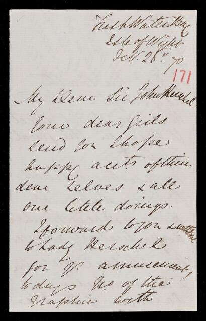 Julia Margaret Cameron, Letter, from Julia Margaret Cameron to Sir John Herschel, dated at Freshwater, I.o.W., 28 February 1870, HS/5/171, The Royal Society Archives, London, https://makingscience.royalsociety.org/items/hs_5_171/letter-from-julia-margaret-cameron-to-sir-john-herschel-dated-at-freshwater-iow, accessed on 07 March 2026