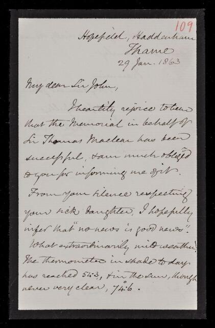 Autograph letter signed by sender. Pleased to hear that the memorial on behalf of Thomas Maclear has been successful. Comments on the mild weather. Hopes the health of his daughter is improving.