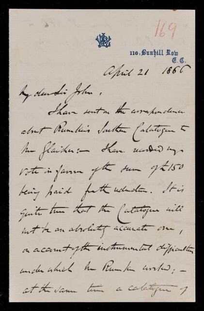Warren de la Rue, Warren de la Rue, Letter, from Warren de La Rue to Sir John Herschel, dated at 110 Bunhill Row, 21 April 1866, HS/6/169, The Royal Society Archives, London, https://makingscience.royalsociety.org/items/hs_6_169/letter-from-warren-de-la-rue-to-sir-john-herschel-dated-at-110-bunhill-row, accessed on 14 January 2026
