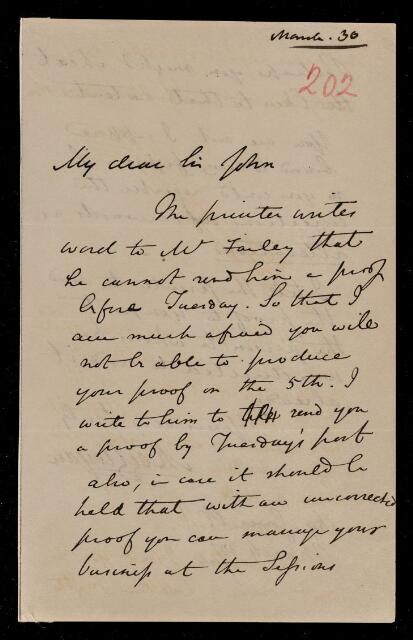 Autograph letter signed by sender. Printer unable to send proof to Richard Farley so John Frederick William Herschel will not be able to have proof by the 5th. Has requested printer to forward proof to John Frederick William Herschel.