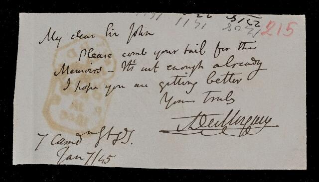 Autograph letter signed by sender. The memoirs are cut enough already. Hopes his health is better.