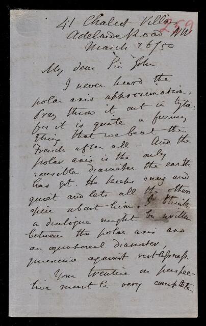 Augustus de Morgan, Letter, from Augustus De Morgan to Sir John Herschel, dated at 41 Chalcot Villas NW, 26 March 1850, HS/6/259, The Royal Society Archives, London, https://makingscience.royalsociety.org/items/hs_6_259/letter-from-augustus-de-morgan-to-sir-john-herschel-dated-at-41-chalcot-villas-nw, accessed on 14 December 2025