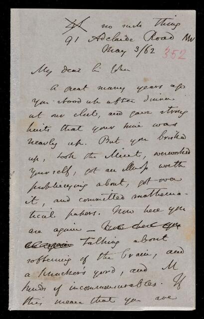 Augustus de Morgan, Letter, from Augustus De Morgan to Sir John Herschel, dated at 91 Adelaide Road, 3 May 1862, HS/6/352, The Royal Society Archives, London, https://makingscience.royalsociety.org/items/hs_6_352/letter-from-augustus-de-morgan-to-sir-john-herschel-dated-at-91-adelaide-road, accessed on 07 November 2025