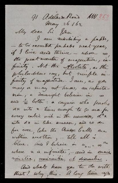 Augustus de Morgan, Letter, from Augustus De Morgan to Sir John Herschel, dated at 91 Adelaide Road, 26 May 1862, HS/6/353, The Royal Society Archives, London, https://makingscience.royalsociety.org/items/hs_6_353/letter-from-augustus-de-morgan-to-sir-john-herschel-dated-at-91-adelaide-road, accessed on 15 November 2025