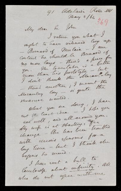 Augustus de Morgan, Letter, from Augustus De Morgan to Sir John Herschel, dated at 91 Adelaide Road, 2 May 1864, HS/6/369, The Royal Society Archives, London, https://makingscience.royalsociety.org/items/hs_6_369/letter-from-augustus-de-morgan-to-sir-john-herschel-dated-at-91-adelaide-road, accessed on 09 November 2025