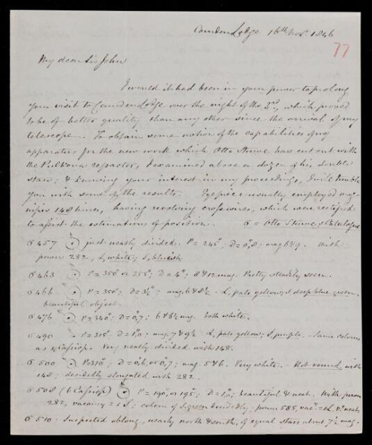 William Rutter Dawes, Letter, from William Rutter Dawes to Sir John Herschel, dated at Camden Lodge, 16 November 1846, HS/6/77, The Royal Society Archives, London, https://makingscience.royalsociety.org/items/hs_6_77/letter-from-william-rutter-dawes-to-sir-john-herschel-dated-at-camden-lodge, accessed on 08 March 2026