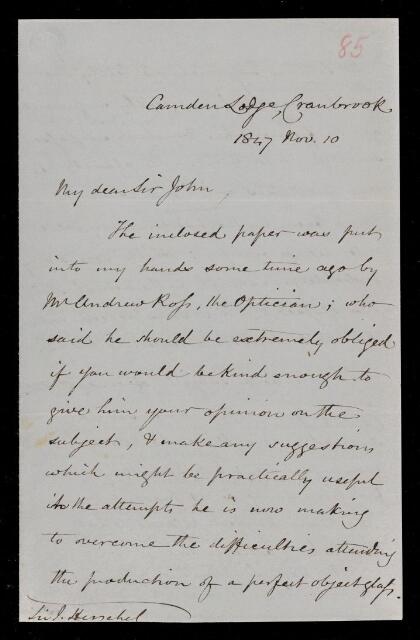 William Rutter Dawes, Letter, from William Rutter Dawes to Sir John Herschel, dated at Camden Lodge, 10 November 1847, HS/6/85, The Royal Society Archives, London, https://makingscience.royalsociety.org/items/hs_6_85/letter-from-william-rutter-dawes-to-sir-john-herschel-dated-at-camden-lodge, accessed on 24 January 2026