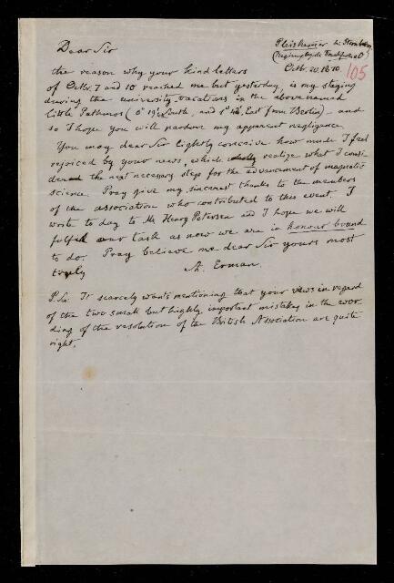 Georg Adolf Erman, Letter, from Georg Adolph Erman to Sir John Herschel, dated at Pleishammer, Stenberg, 20 October 1870, HS/7/105, The Royal Society Archives, London, https://makingscience.royalsociety.org/items/hs_7_105/letter-from-georg-adolph-erman-to-sir-john-herschel-dated-at-pleishammer-stenberg, accessed on 16 March 2026